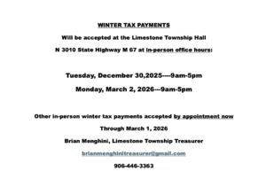WINTER TAX PAYMENTS Will be accepted at the Limestone Township Hall N 3010 State Highway M 67 at in-person office hours: Tuesday, December 30,2025—-9am-5pm Monday, March 2, 2026—9am-5pm Other in-person winter tax payments accepted by appointment now Through March 1, 2026 Brian Menghini, Limestone Township Treasurerbrianmenghinitreasurer@gmail.com906-446-3363